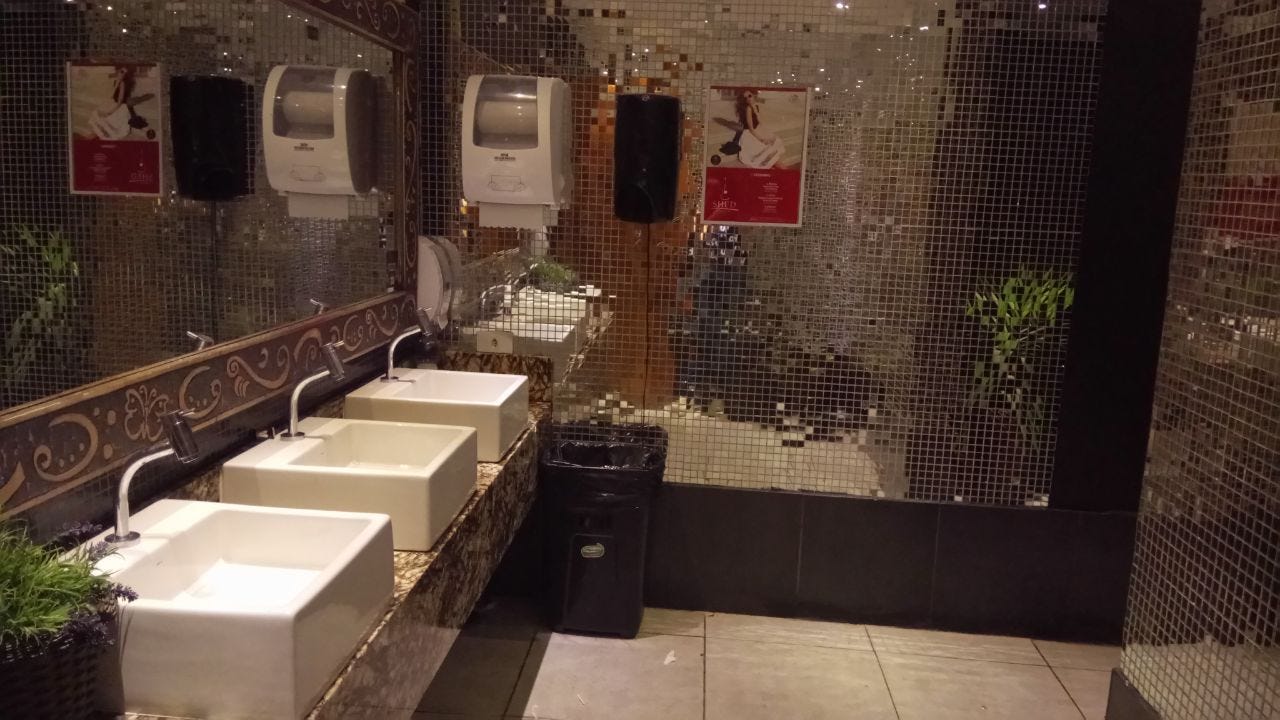 ninguém menciona que, naquele momento, eu pensei que poderia simplesmente lavar as mãos e sair. ninguém menciona que a maioria das mulheres já esteve naquele banheiro, mesmo que em outro endereço.